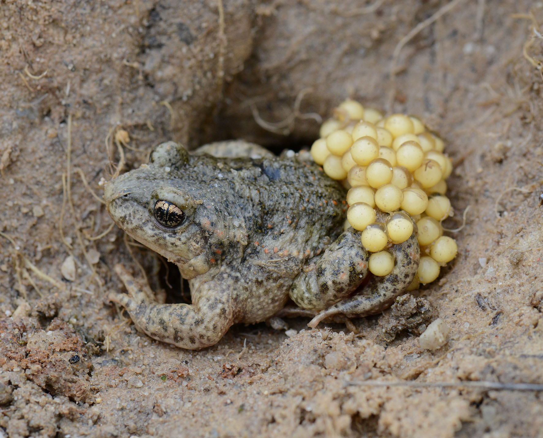 Bild zeigt: Männliche Geburtshelferkröte mit Eischnüren. Quelle: Hubert Laufer.