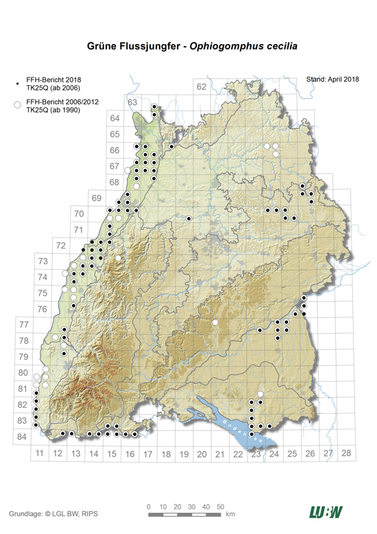 Eine Karte der FFH-Gebiete mit Vorkommen der Grünen Flussjungfer und weitere Informationen zu den Gebieten erhalten Sie im Daten- und Kartendienst der LUBW.