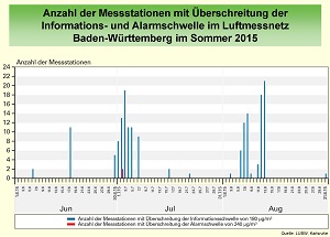 In diesem Jahr wurde der Grenzwert für Ozoninformation bisher an drei Tagen an den folgenden Messstationen überschritten: 23.6.2016: Baden-Baden196 µg/m³; 24.6.2016: Schwäbisch Hall 201 µg/m³; Ludwigsburg 199 µg/m³; Stuttgart Bad-Cannstatt 185 µg/m³; 7.7.2016: Mannheim Nord 204 µg/m³.