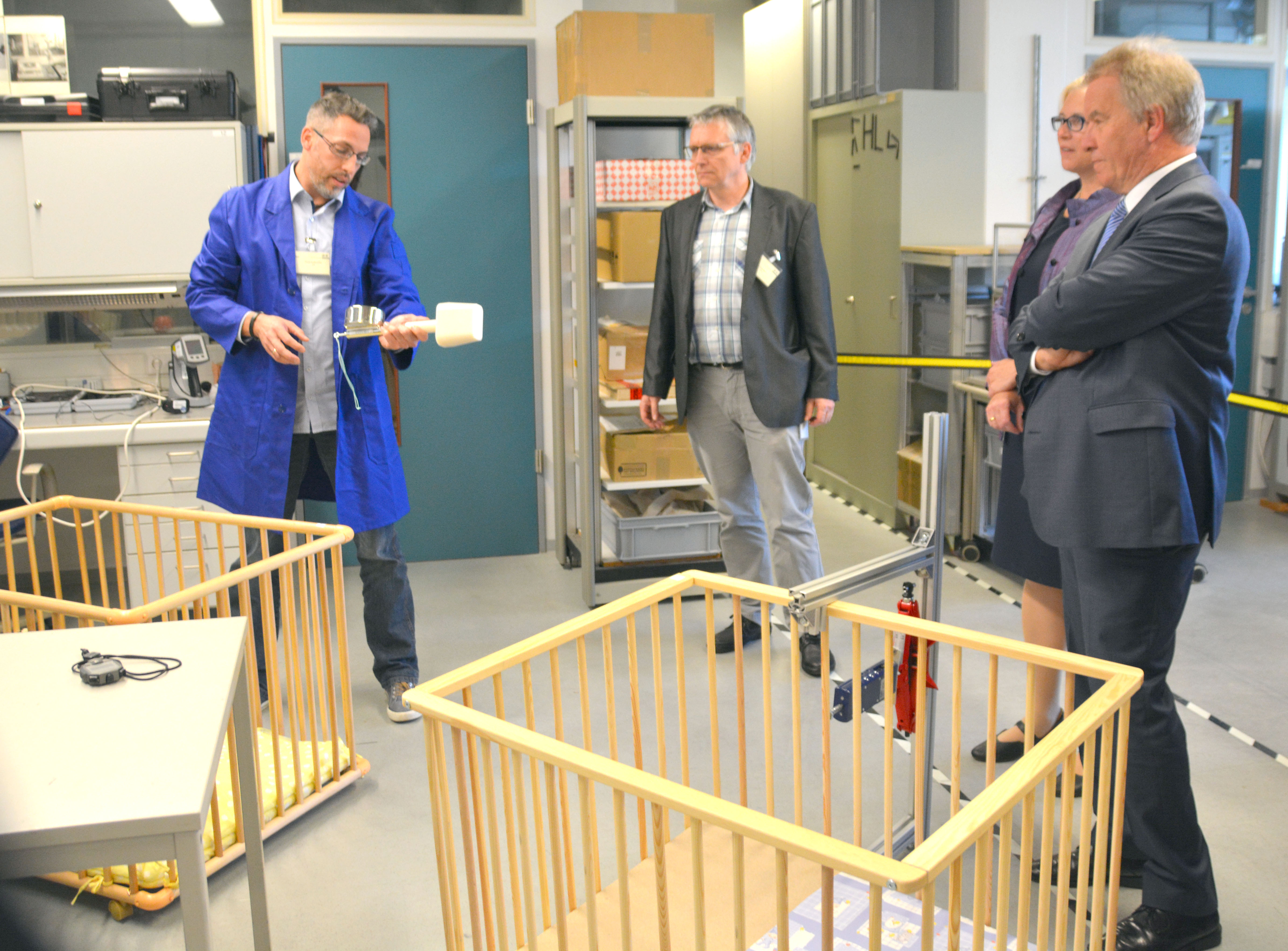 In den Jahren 2015 und 2016 wurden in der Geräteuntersuchungsstelle rund 550 sicherheitstechnische Untersuchungen zu folgenden Produkten durchgeführt: Elektrohobel, Fahrradhelme, Flaschenwärmer/-sterilisatoren, Handkreissägen, Heißklebepistolen, Heizkissen, Laserprodukte, Laufställe, Leitungsroller, Netzteile, Plüschspielzeug, Roboter-Rasenmäher, Skihelme, Spielzeug (elektrisch), Stromgeneratoren, Verlängerungsleitungen und Zurrgurte. Eine aufwendigere Aktion war in diesem Zeitraum die Prüfung der Roboter-Rasenmäher, die dem Minister beim heutigen Besuch vorgestellt wurde.