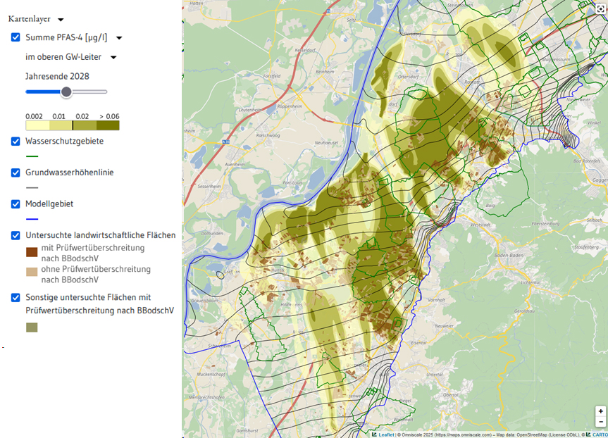 Die Simulation basiert auf dem Grundwassermodell der LUBW für Mittelbaden, das auf der Basis des großräumigen Grundwassermodells Basel-Karlsruhe entwickelt wurde, das im Rahmen der grenzüberschreitenden Projekte LOGAR (Länderübergreifende Organisation für Grundwasserschutz am Rhein) und MoNit (Modellierung der Grundwasserbelastung durch Nitrat im Oberrheingraben) erstellt wurde. Das Grundwassermodell der LUBW ist ein wichtiges Instrument, um die Entwicklung der PFAS-Belastung zu verstehen und zukünftige Maßnahmen zu planen.