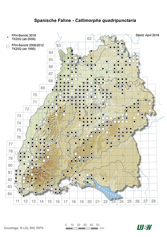 Eine Karte der FFH-Gebiete mit Vorkommen der Spanischen Fahne und weitere Informationen zu den Gebieten erhalten sie im Daten- und Kartendienst der LUBW.
