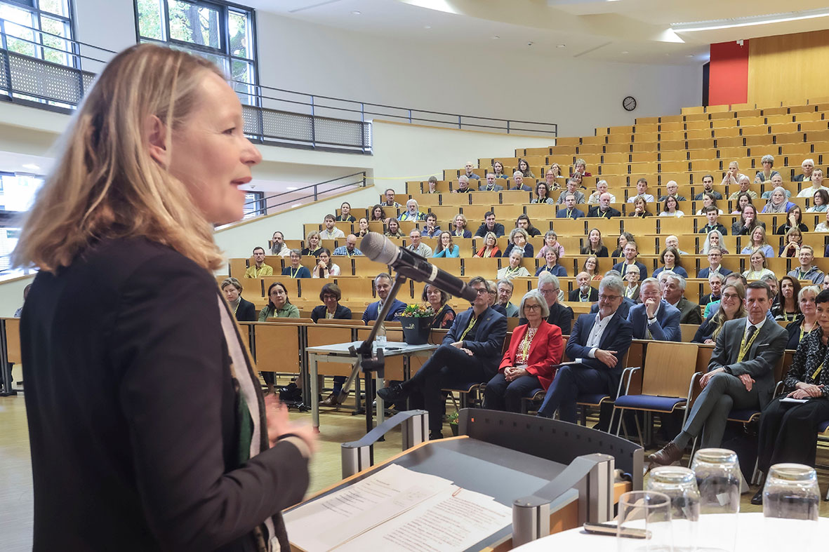 Foto zeigt: Umweltministerin Thekla Walker MdL während ihrer Festrede im Audimax des Karlsruher Instituts für Technologie (KIT). Bildquelle: Foto Fabry.