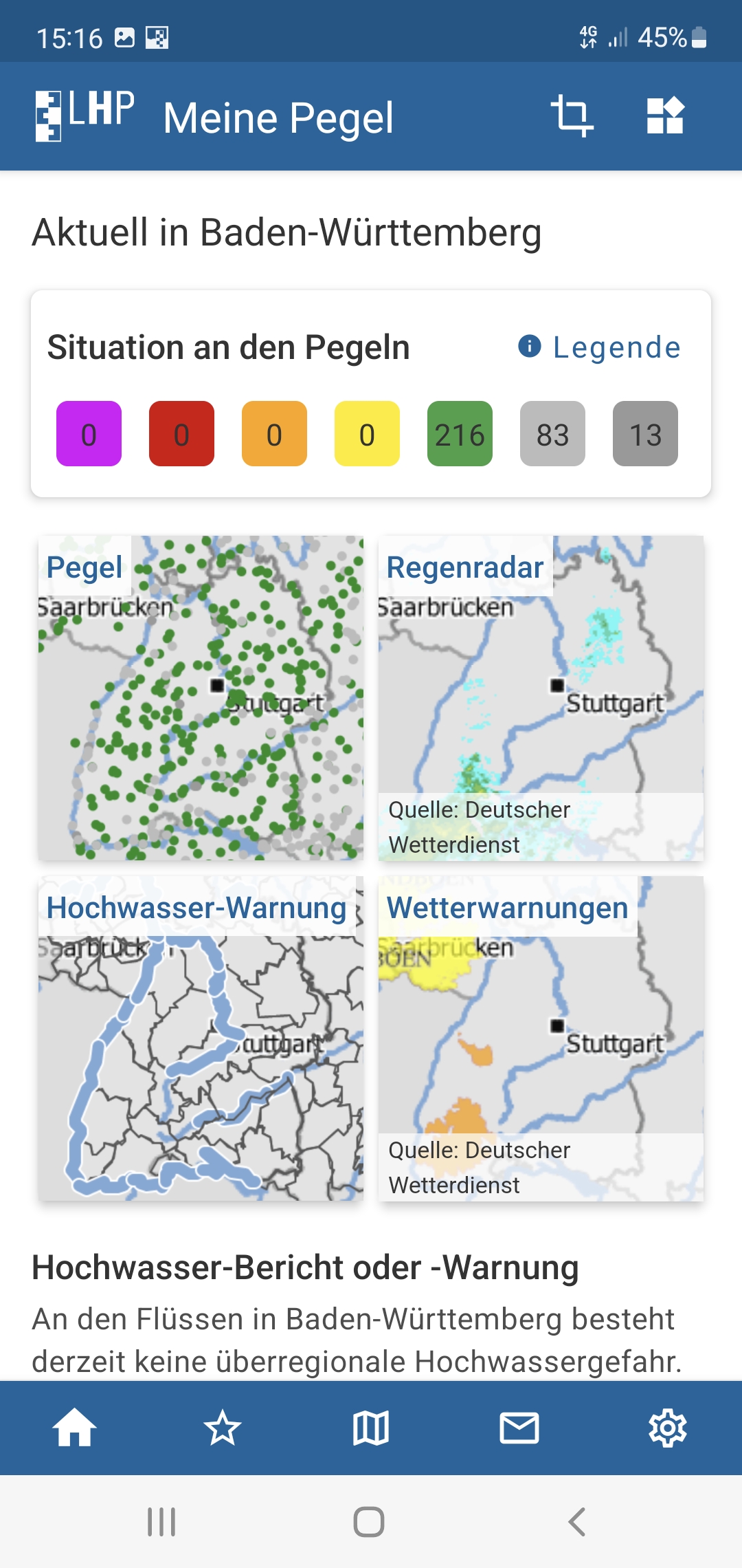 Basis für die App „Meine Pegel“ ist das Länderübergreifende Hochwasserportal (LHP) www.hochwasserzentralen.de. Die Daten stammen von den für Hochwasser zuständigen Dienststellen der Bundesländer und den Hochwasserzentralen in benachbarten Staaten sowie der Wasserstraßen- und Schifffahrtsverwaltung des Bundes. Ob in der App oder im Internet, mit einem Blick ist nun zu erkennen, in welchen Teileinzugsgebieten oder Flussabschnitten vor akuter Hochwassergefahr gewarnt wird. „Sowohl im Länderübergreifenden Hochwasserportal als auch in der App ‚Meine Pegel‘ werden die Daten für alle Länder nahezu in Echtzeit bereitgestellt. Denn: Fluten machen an Landesgrenzen nicht Halt“, betont Werner Altkofer, stellvertretender Präsident der LUBW Landesanstalt für Umwelt Baden-Württemberg.