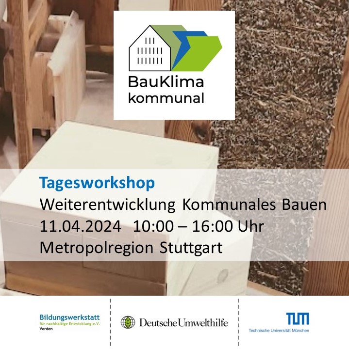 - Tagesworkshop Kommunales Bauen und Klimaschutz in der Metropolregion Stuttgart 11.04.2024 (Flyer und Einladung, Anmeldung: Bildungswerkstatt für nachhaltige Entwicklung e.V., info@biwena.de, 04231-960 254 51)