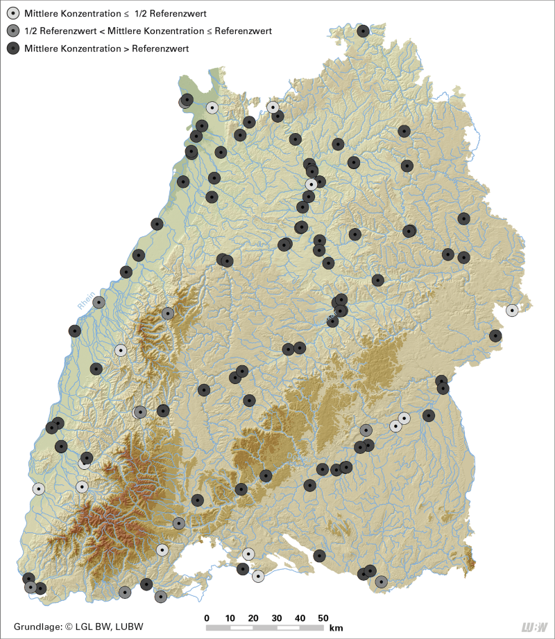 Das alles gilt nicht nur für Medikamentenrückstände, sondern auch für viele andere Chemikalien, die uns im Alltag begegnen, etwa in Reinigungsmitteln und Pestiziden. Deswegen ist es wichtig, die Vielfalt und Verbreitung dieser Spurenstoffe in unseren Gewässern zu kennen. Der Bericht „Spurenstoffinventar der Fließgewässer“ der LUBW wertet hierzu tausende Einzelmessungen von rund 90 Stoffen an 114 Flüssen unterschiedlicher Größe in Baden-Württemberg aus.