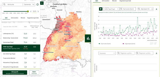 Mit dem neuen Klimaschutz- und Klimaanpassungsgesetz BW hat der Klimaatlas zusätzlich an Bedeutung gewonnen, da hier relevante und gesetzlich geforderte Daten direkt abrufbar sind. Dank der kontinuierlichen Weiterentwicklung des Portals konnten im Sommer 2025 zwei weitere Kartenviewer veröffentlicht werden. Dabei wurden sowohl Darstellungen zum Klima der Vergangenheit als auch zur Zukunft erweitert. Ein weiterer Meilenstein war die Umstellung des Klimaatlas BW auf das neue Landesdesign.