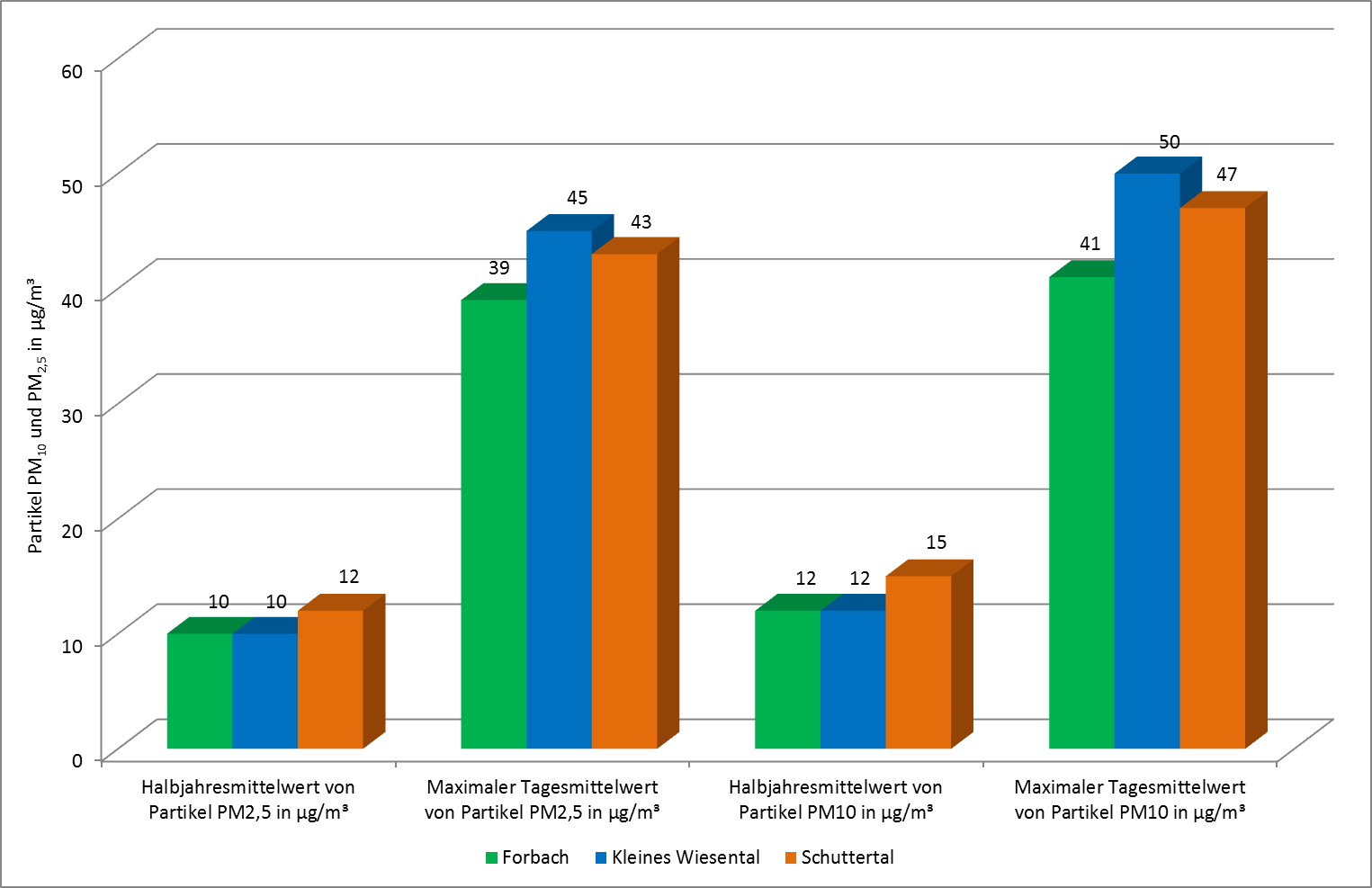 Die vorliegenden Messergebnisse aus dem ersten Halbjahr zeigen für die Feinstaubfraktionen Partikel PM10 und PM2,5 eine sichere Einhaltung der Immissionsgrenzwerte. Der Jahresgrenzwert für Feinstaub PM10 beträgt 40 Mikrogramm pro Kubikmeter Luft. Der gemittelte Wert für das erste halbe Jahr für Feinstaub PM10 lag in Forbach und Klein Wiesental bei 12 Mikrogramm und in Schuttertal bei 15 Mikrogramm pro Kubikmeter Luft. Damit liegen die erfassten Werte weit unter dem Immissionsgrenzwert von 40 Mikrogramm pro Kubikmeter Luft, entsprechend ist eine Überschreitung des Jahresgrenzwertes nicht zu erwarten. Das Gleiche gilt für Feinstaub PM 2,5. Details können der angefügten Grafik und Tabelle entnommen werden.