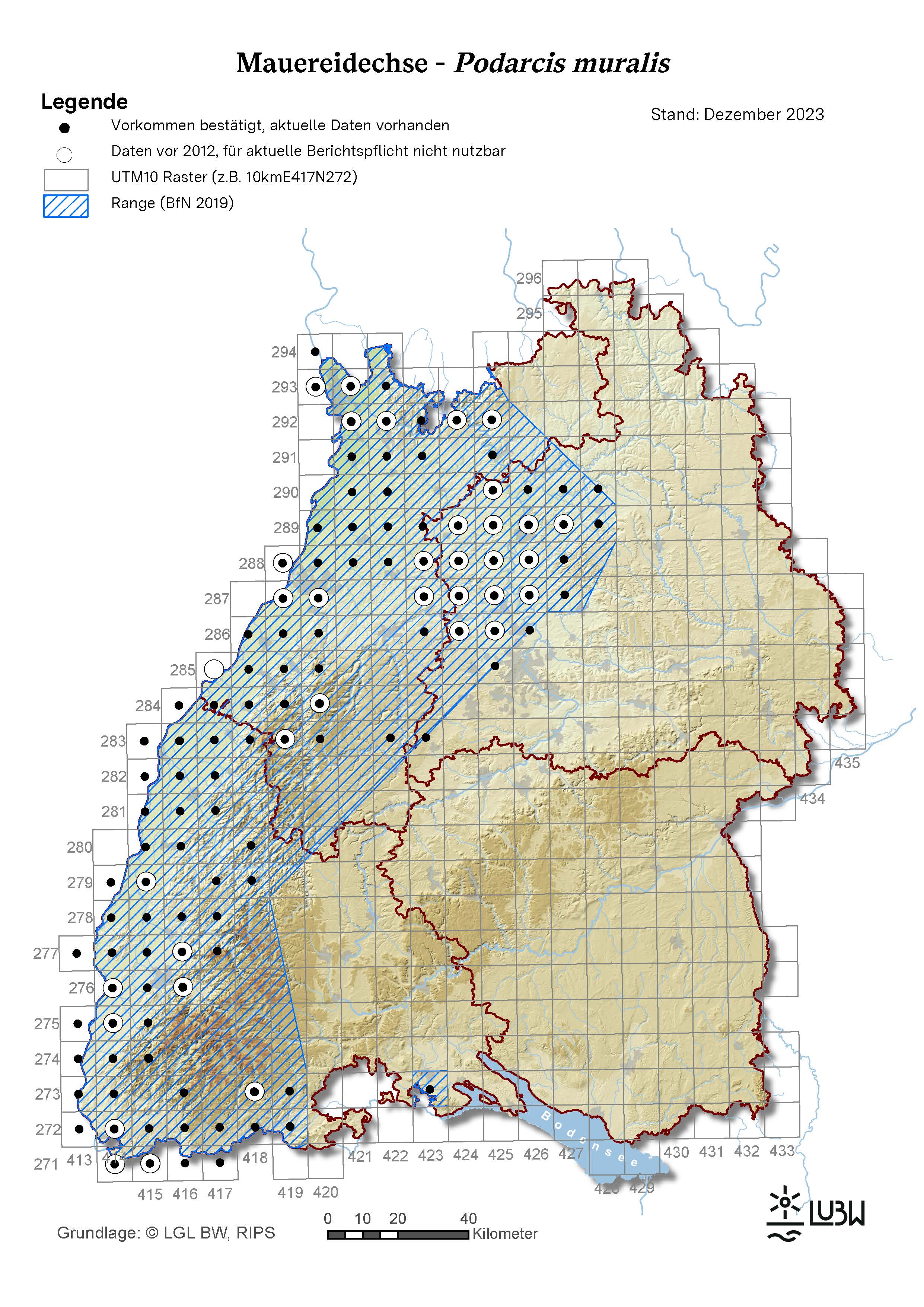 In Baden-Württemberg besiedelt die Art weite Teile der Oberrheinebene, den unteren Neckar, den östlichen Kraichgau, den Hochrhein sowie den West- und Südrand des Schwarzwaldes. Die autochthonen Vorkommen in Baden-Württemberg gehören zur Unterart Podarcis muralis brongniardii. Darüber hinaus haben sich auch in Baden-Württemberg infolge von Verschleppungen und Aussetzungen eine Vielzahl von Populationen innerhalb und außerhalb des natürlichen Areals etabliert, die verschiedenen genetischen Linien (bzw. Unterarten) zuzurechnen sind.
