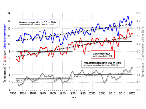 Die Jahresmittelwerte der Lufttemperatur am Bodensee lagen in den Jahren 1991 bis 2020 im Durchschnitt um 1,3 Grad höher als in den rund drei Jahrzehnten davor. Gleiches gilt für die Wassertemperatur an der Seeoberfläche, die im Vergleichszeitraum um rund 1,2 Grad Celsius gestiegen ist. Diese Temperaturanstiege beeinflussen auch die Wassertemperatur in 250 Metern Tiefe.