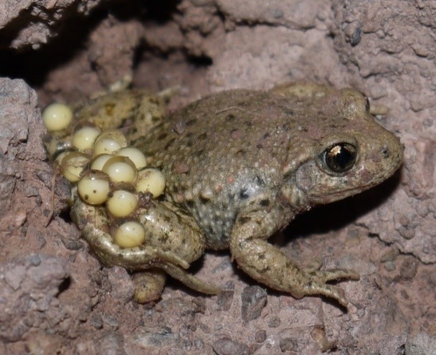 Bild zeigt: Besondere Brutpflege: Geburtshelfer-Männchen tragen die Laichschnüre um die Hinterbeine gewickelt. Quelle: Michael Waitzmann.