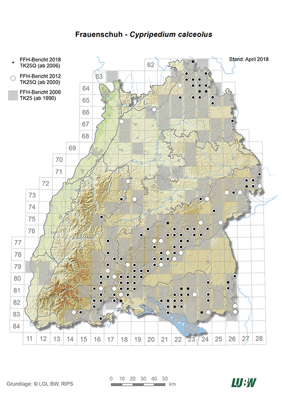 Eine Karte der FFH-Gebiete mit Vorkommen des Frauenschuhs und weitere Informationen zu den Gebieten erhalten Sie im Daten- und Kartendienst der LUBW.