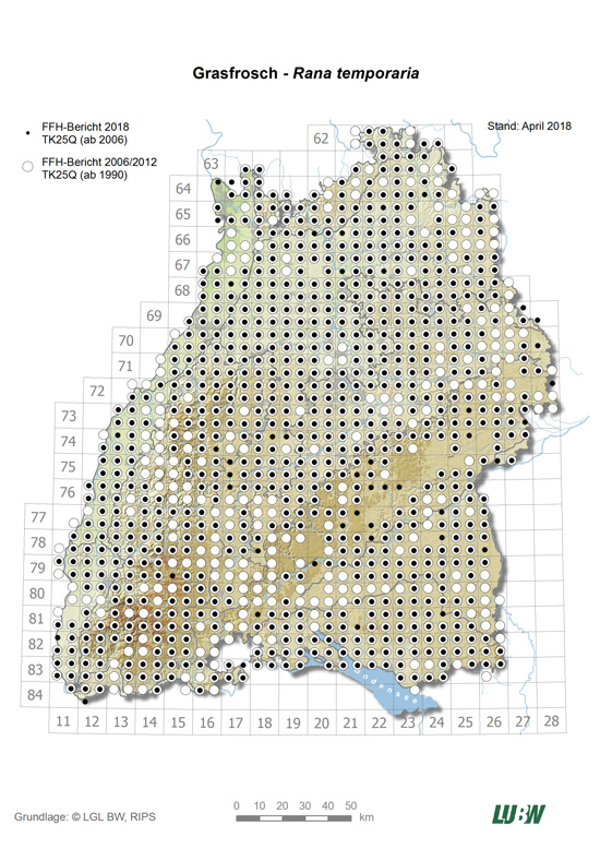 Der Grasfrosch ist in weiten Teilen Baden-Württembergs die häufigste Amphibienart. Derzeit wird eine rückläufige Tendenz von Beständen in einzelnen Landesteilen gemeldet- Die Zukunftsaussichten sind noch als günstig zu betrachten.