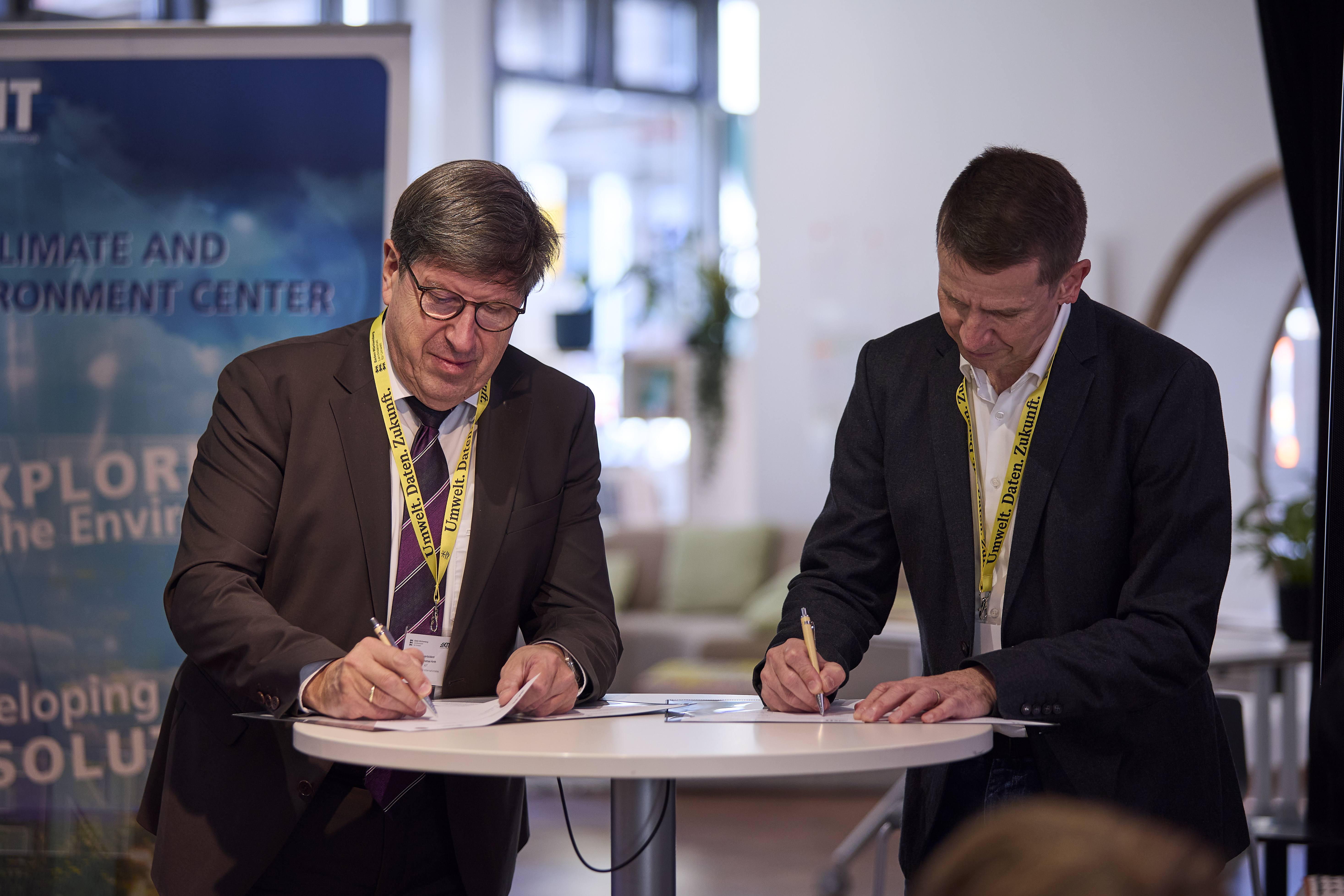 Professor Dr. Thomas Hirth, Vizepräsident Transfer und Internationales des KIT, und Dr. Ulrich Maurer, Präsident der LUBW, unterzeichneten die Vereinbarung am Dienstag im Veranstaltungsort „TRIANGEL“ des KIT am Karlsruher Kronenplatz im Rahmen der gemeinsamen Veranstaltung „Innovative Umweltforschung in THE LÄND“.