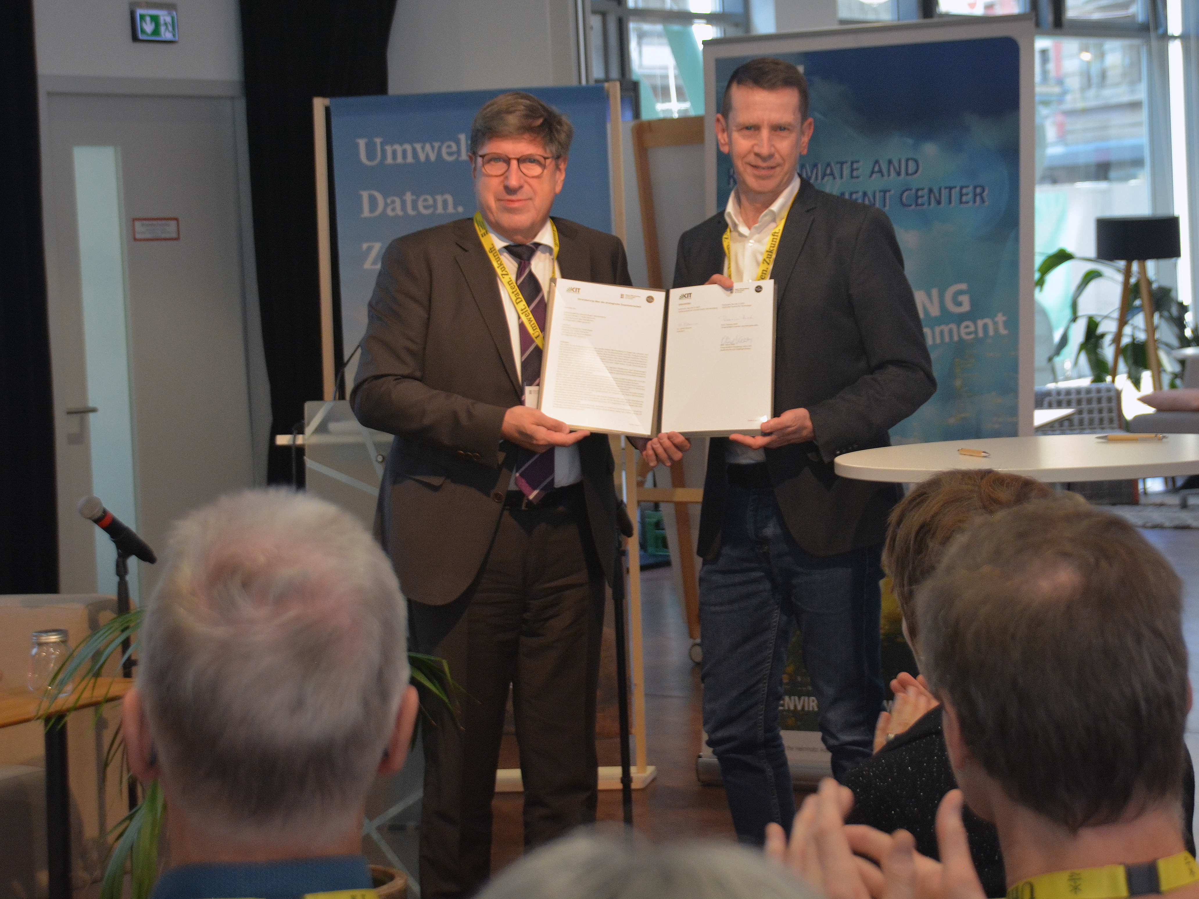 Foto zeigt v. l. n. r.: Professor Dr. Thomas Hirth, Vizepräsident Transfer und Internationales des KIT, und Dr. Ulrich Maurer, Präsident der LUBW, mit der unterzeichneten aktualisierten Vereinbarung im Rahmen der gemeinsamen Veranstaltung „Innovative Umweltforschung in THE LÄND“. Quelle: LUBW.