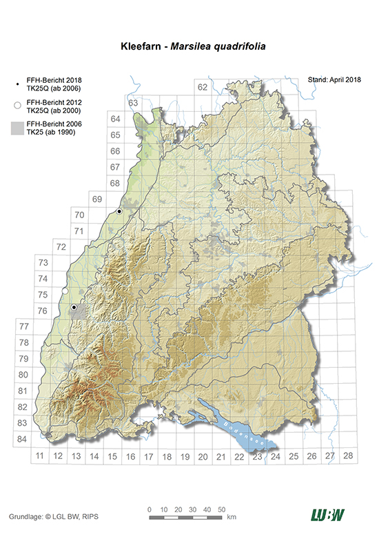 Eine Karte der FFH-Gebiete mit Vorkommen des Kleefarns und weitere Informationen zu den Gebieten erhalten Sie im Daten- und Kartendienst der LUBW.