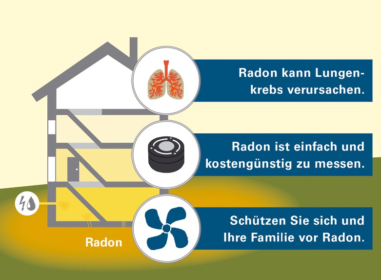 Radon ist ein nicht wahrnehmbares Gas, das überall im Boden vorkommen kann. Sammelt es sich in Innenräumen an, kann es gefährlich für die Gesundheit werden. Nach Rauchen ist Radon die zweithäufigste Ursache für Lungenkrebs. Ein Schutz vor Radon ist jedoch möglich, beispielsweise durch Lüften. Auch technische Lösungen helfen, die Radonmenge in Innenräumen zu senken. Dazu gehören beispielsweise der Einbau einer Lüftungsanlage oder zusätzliche Abdichtungen am oder im Gebäude.
