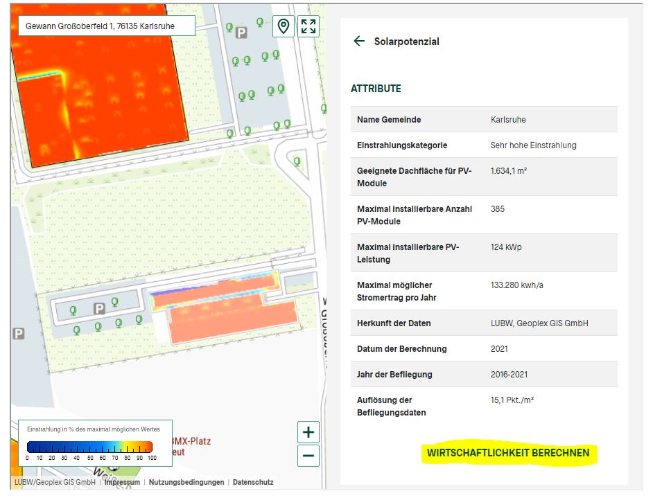 Das Solardachkataster ist ein Baustein des Energieatlas Baden-Württemberg, dem gemeinsamen Internet-Portal der LUBW und des Umweltministeriums zum Thema erneuerbare Energien. Eva Bell, Präsidentin der LUBW Landesanstalt für Umwelt Baden-Württemberg, präsentiert die umfangreichen Berechnungsmöglichkeiten: „Die LUBW bietet Bürgerinnen und Bürgern mit dem Solardachkataster eine solide Analysemöglichkeit. Besonders hilfreich ist ein Wirtschaftlichkeitsrechner zur Gewinnung von Wärme und Strom aus Solarenergie.“ Kosten, Effizienz sowie Einsparpotenziale von CO2-Emissionen können mit Hilfe des umfangreichen Rechners genauso abgeschätzt werden wie Amortisationszeit und Autarkiegrad. Die Anzahl der im Haushalt lebenden Personen kann berücksichtigt werden sowie tägliche Lastgangprofile oder die Nutzung von Batteriespeichern und Wärmepumpen. Es können auch unterschiedliche Mobilitätsfaktoren in die Berechnung einfließen, beispielsweise die Anzahl von E-Bikes und E-Autos im Haushalt oder im Gebäude, einschließlich Fahrleistung, Fahrzeugtyp sowie die Strecke zur Arbeit. Die individuellen Berechnungen werden übersichtlich in Grafiken und Tabellen präsentiert und lassen sich auch abspeichern.
