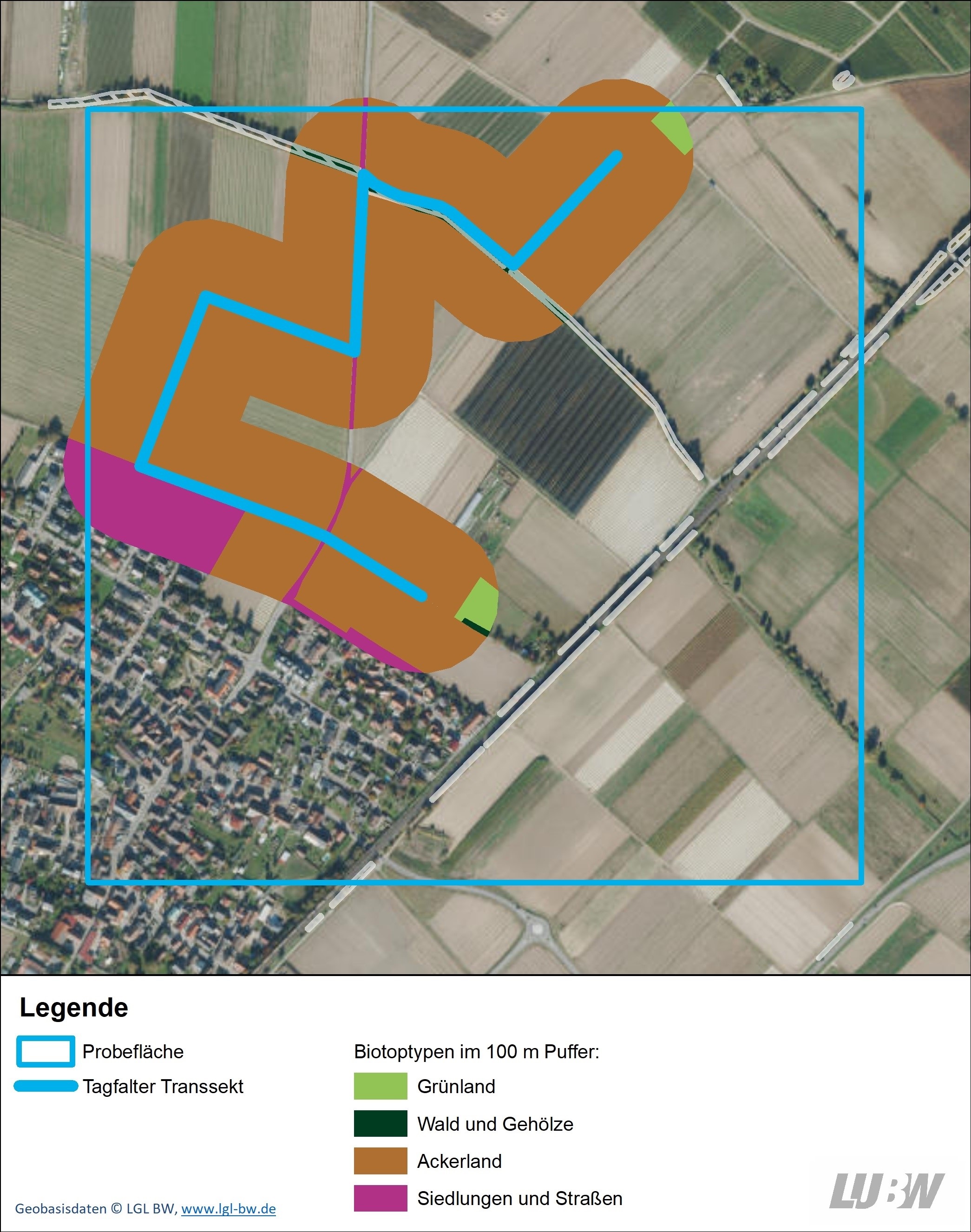 In Abbildung 1 ist ein artenarmes Transekt dargestellt, das überwiegend von Ackerflächen umgeben ist. Der Pufferbereich deckt daneben in geringem Umfang auch Siedlungen, Grünland (Wiesen und Weiden) sowie Gehölze ab. Gesetzlich geschützte Biotope finden sich in diesem Bereich nicht.