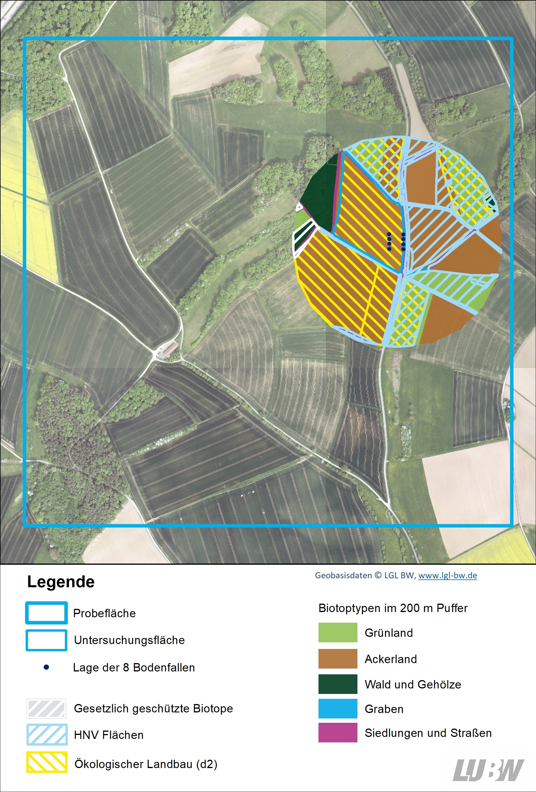 Für die Laufkäfer und die Biomasse Boden wurden die Einflussgrößen (Umweltvariablen) in einem Pufferbereich von 200 m Radius um die beiden Bodenfallen-Transekte ausgewertet. Die Abbildungen 3 und 4 zeigen beispielhaft die Fallentransekte (blaue Punkte), die Abgrenzung des untersuchten Ackerschlags (blaue Linie, Polygon) und den Pufferbereich von 200 m Radius um den Fallenstandort. Während der Pufferbereich der Untersuchungsfläche in Abbildung 3 keinen ökologischen Landbau (D 2) und nur sehr wenig Flächenanteil HNV aufweist, zeigt Abbildung 4 eine Fläche mit hohen Anteilen dieser beiden Einflussgrößen.