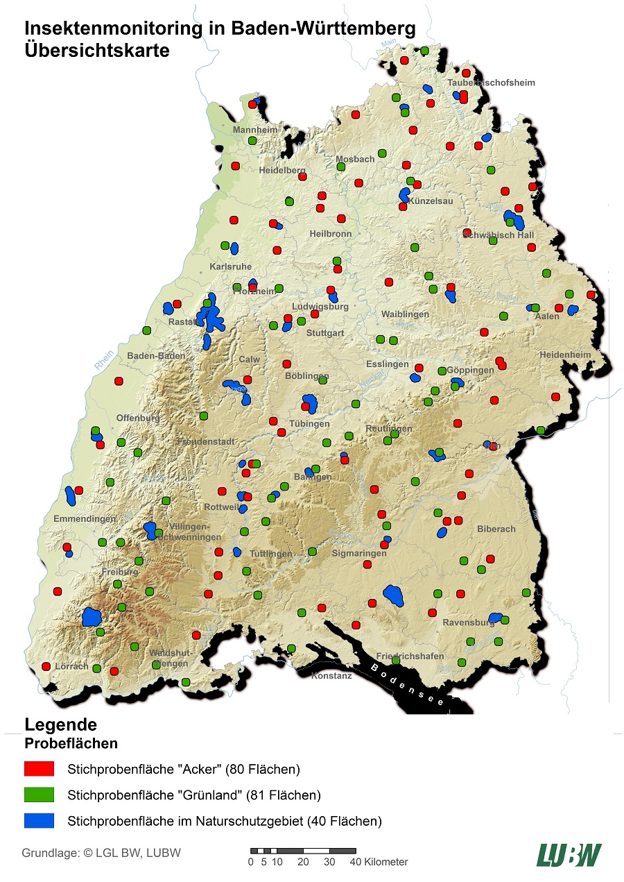 Um das Offenland abzubilden, wurden 161 Stichprobenflächen „Acker“ und „Grünland“ für das Insektenmonitoring ausgewählt. Die jeweils einen Quadratkilometer großen Quadranten repräsentieren statistisch Acker und Grünland, beinhalten aber auch Wald, Siedlungsgebiete etc. Zusätzlich werden Erhebungen in 40 Naturschutzgebieten durchgeführt, um einen Vergleich mit geschützten Landschaftsteilen zu ermöglichen. Pro Jahr kann ein Drittel bzw. ein Viertel der Flächen bearbeitet werden. Damit werden nach vier Jahren erstmals Daten für die gesamte Stichprobenkulisse vorliegen.