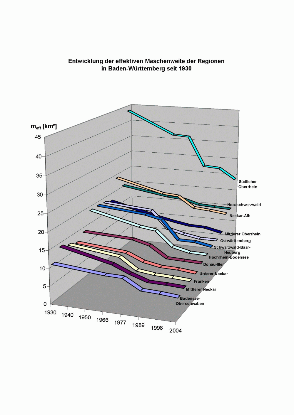 Sehr gravierend scheint die Entwicklung in der Region "Südlicher Oberrhein". Obwohl insgesamt ein geringerer Rückgang der effektiven Maschenweite zu verzeichnen ist, als in den beiden letztgenannten Regionen, verschlechtert sich hier die Situation von einem sehr hohen Niveau im Jahr 1930 (meff=43,4 km²) auf 24,1 km² im Jahr 2004. Der stärkste Rückgang wird zwischen den Jahren 1977 und 1989 registriert.
