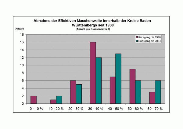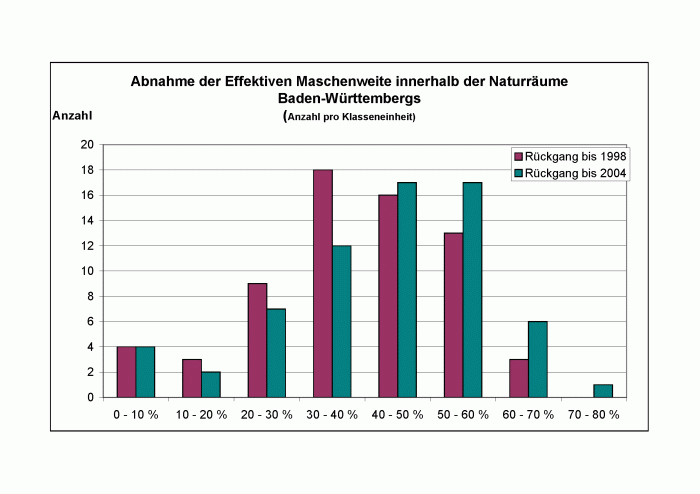 Die stärksten Rückgänge seit 1930 zeigen sich außer in den Stadtkreisen wiederum im Bodenseekreis, sowie in den Landkreisen Göppingen, Karlsruhe, Waldshut-Tiengen und im Rems-Murr-Kreis. Die Werte liegen zwischen 10,5 % im Kreis Baden-Baden und 69,4% im Stadtkreis Karlsruhe. Vergleicht man die Rückgänge von 1998 und 2004 (s. Diagramm), so zeigt sich, dass die Zerschneidung immer noch weiter zunimmt. Im Gegensatz zu 1998 ist die Klasse "Rückgang um 0 - 10 %" im Jahr 2004 nicht mehr besetzt. Gleichzeitig erhöht sich die Anzahl der Kreise in den Klassen "40 - 50%" sowie "60 - 70%".