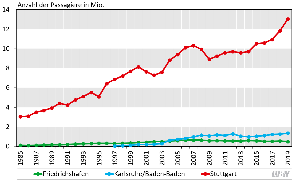 Der Flugverkehr der drei Flughäfen in Baden-Württemberg hat sich in den vergangenen 30 Jahren insgesamt durch eine hohe Wachstumsdynamik ausgezeichnet (siehe Abbildung). Die Fluggastzahlen auf dem Flughafen Stuttgart verzeichneten im Jahr 2019 mit 13,0 Mio. Personen einen erneuten Höchstwert. Der Regionalflughafen Karlsruhe/Baden-Baden erreichte 2019 mit 1,35 Mio. Passagieren ebenfalls einen neuen Höchstwert. Am Regionalflughafen Friedrichshafen wurden im Jahr 2019 rund 490.000 Passagiere abgefertigt, bisheriger Höchstwert waren 660.000 Fluggäste im Jahr 2006. Insgesamt wurden an den drei genannten Flughäfen im Jahr 2019 rund 14,9 Mio. Fluggäste abgefertigt und damit so viele wie nie zuvor.