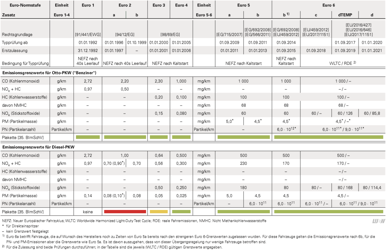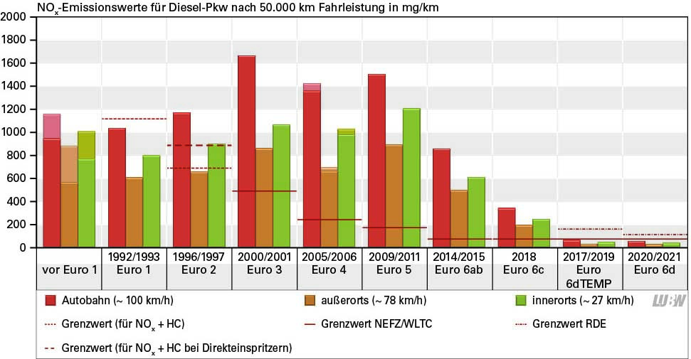Bei den NOx-Emissionen der Dieselfahrzeuge wurden hingegen wenig Fortschritte erzielt. Erst die Einführung der Euro 6-Norm hat hier zu einer Verbesserung geführt, wenngleich die Grenzwerte im Realbetrieb zunächst noch deutlich überschritten wurden: