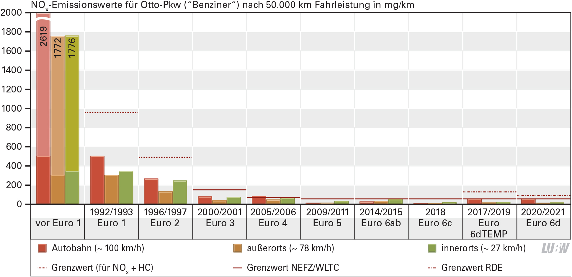 Die Emissionsgesetzgebung über Abgasgrenzwerte war in der Vergangenheit sehr erfolgreich. So sind die realen NOx-Emissionen von Ottofahrzeugen seit der Einführung von Grenzwerten unter allen Betriebsbedingungen deutlich zurückgegangen: