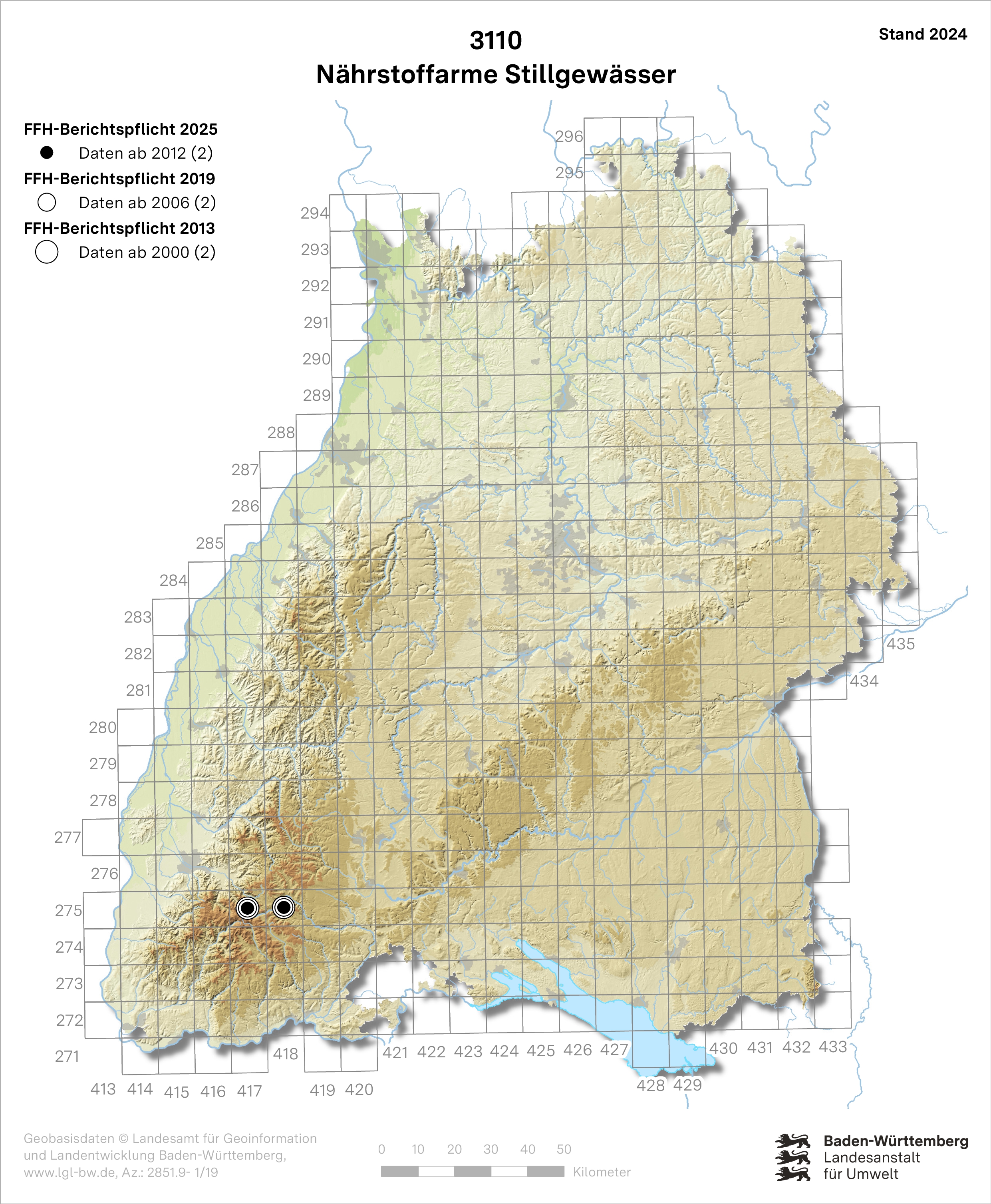Zum Lebensraumtyp 3110 werden in Baden-Württemberg nur der Feldsee und der Titisee im Schwarzwald gerechnet. 2025 beträgt die gemeldete LRT-Gesamtfläche 115 ha. Alle bekannten Bestände des LRT liegen in FFH-Gebieten.