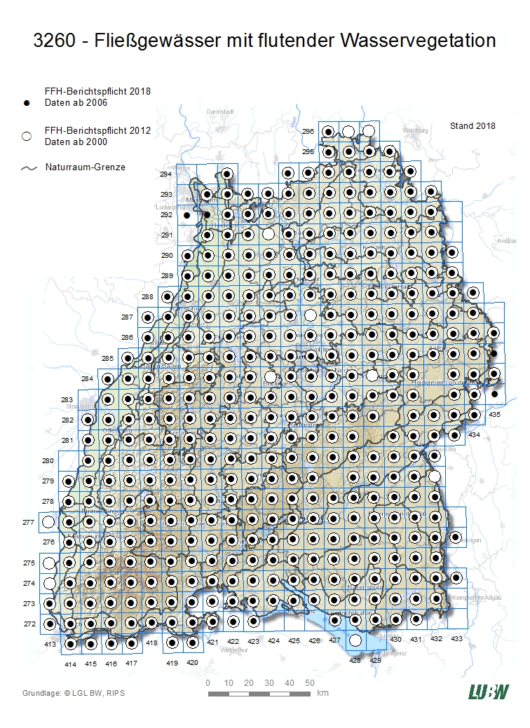 Dieser Lebensraumtyp (vor allem Fließgewässer mit Gesellschaften der Wasserhahnenfußarten) tritt in vielen naturnahen Gewässern des Landes auf. Verbreitungsschwerpunkte sind in den Naturräumen Schwarzwald, Schwäbisch Fränkischer Wald, Alpenvorland, Albvorland, Schönbuch und Glemswald, Stromberg und Odenwald sowie in Teilbereichen an Donau, Argen, Wutach, Murg, Neckar, Rems, Enz, Nagold, Kocher, Jagst und Tauber vorhanden. 2018 beträgt die gemeldete LRT-Gesamtfläche 2.500 ha. Ein Großteil der Bestände des LRT liegt in FFH-Gebieten