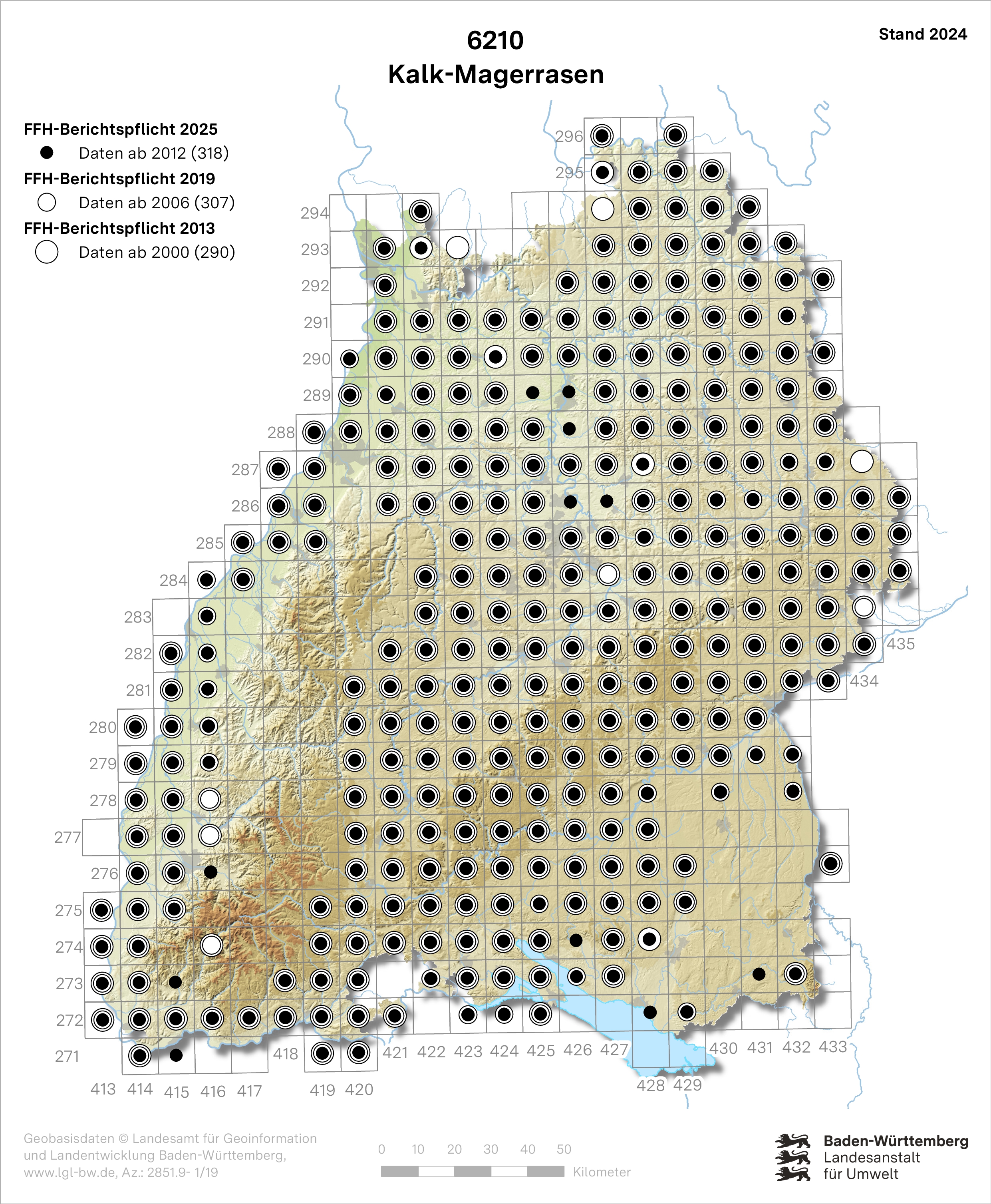 Trocken- und Halbtrockenrasen kommen einschließlich der genannten Ausprägungen vor allem in den Naturräumen Schwäbische Alb, Kaiserstuhl, Markgräfler und Offenburger Rheinniederung, Schwäbisches Keuper-Lias-Land und Neckar- und Tauber-Gäuplatten vor. 2025 beträgt die gemeldete LRT-Gesamtfläche 6.900 ha. Der überwiegende Teil der Bestände des LRT liegt in FFH-Gebieten.