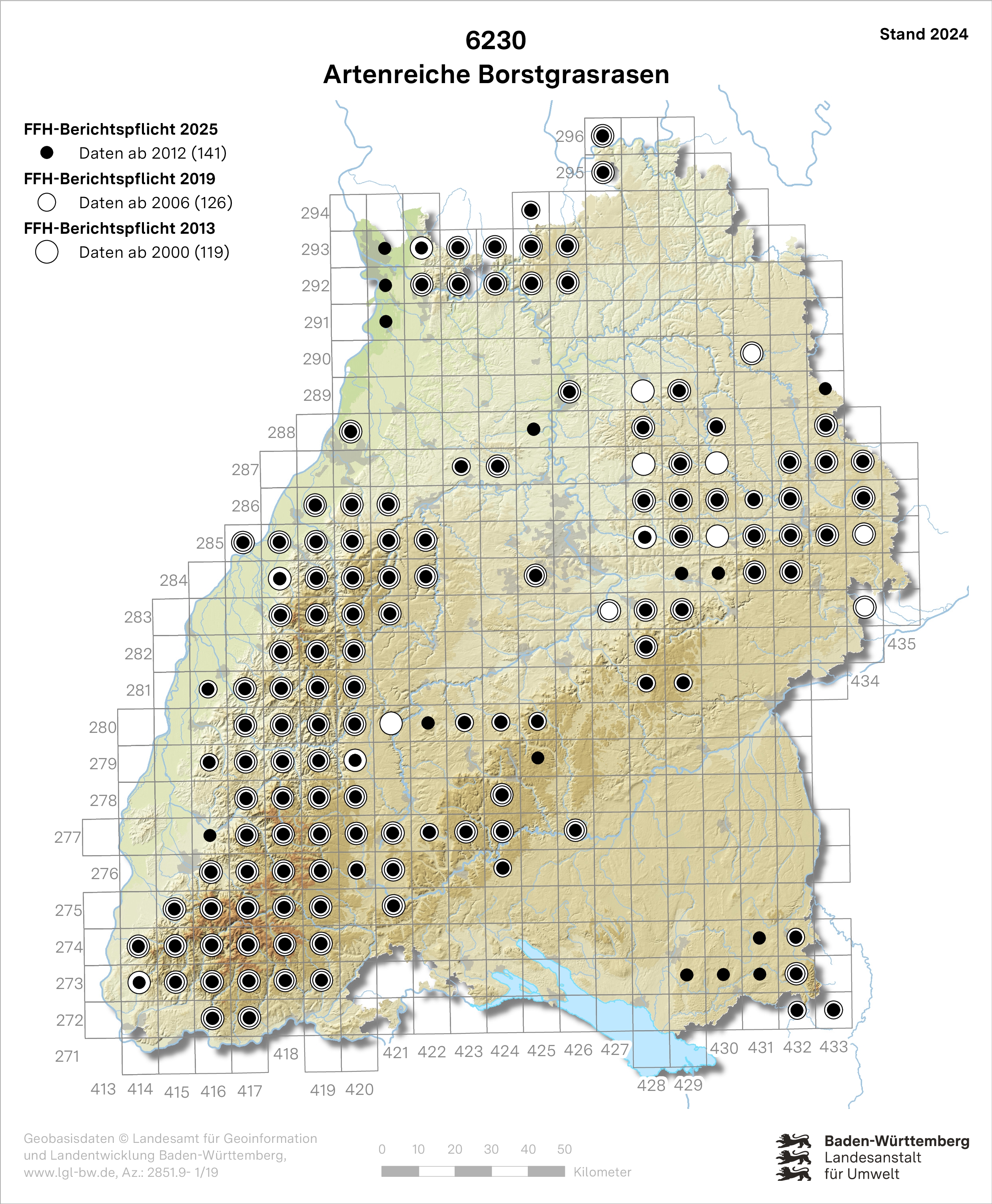 Die artenreichen Borstgrasrasen sind seit Jahrhunderten ein prägendes Landschaftselement in Baden-Württemberg. Sie haben großflächige Vorkommen im Schwarzwald, vereinzelte auf der Schwäbischen Alb, im Odenwald und im Schwäbisch-Fränkischen Wald. Kleinflächig kommen sie im Rheintal vor. 2025 beträgt die gemeldete LRT-Gesamtfläche 3.700 ha. Der überwiegende Teil der Bestände des LRT liegt in FFH-Gebieten.