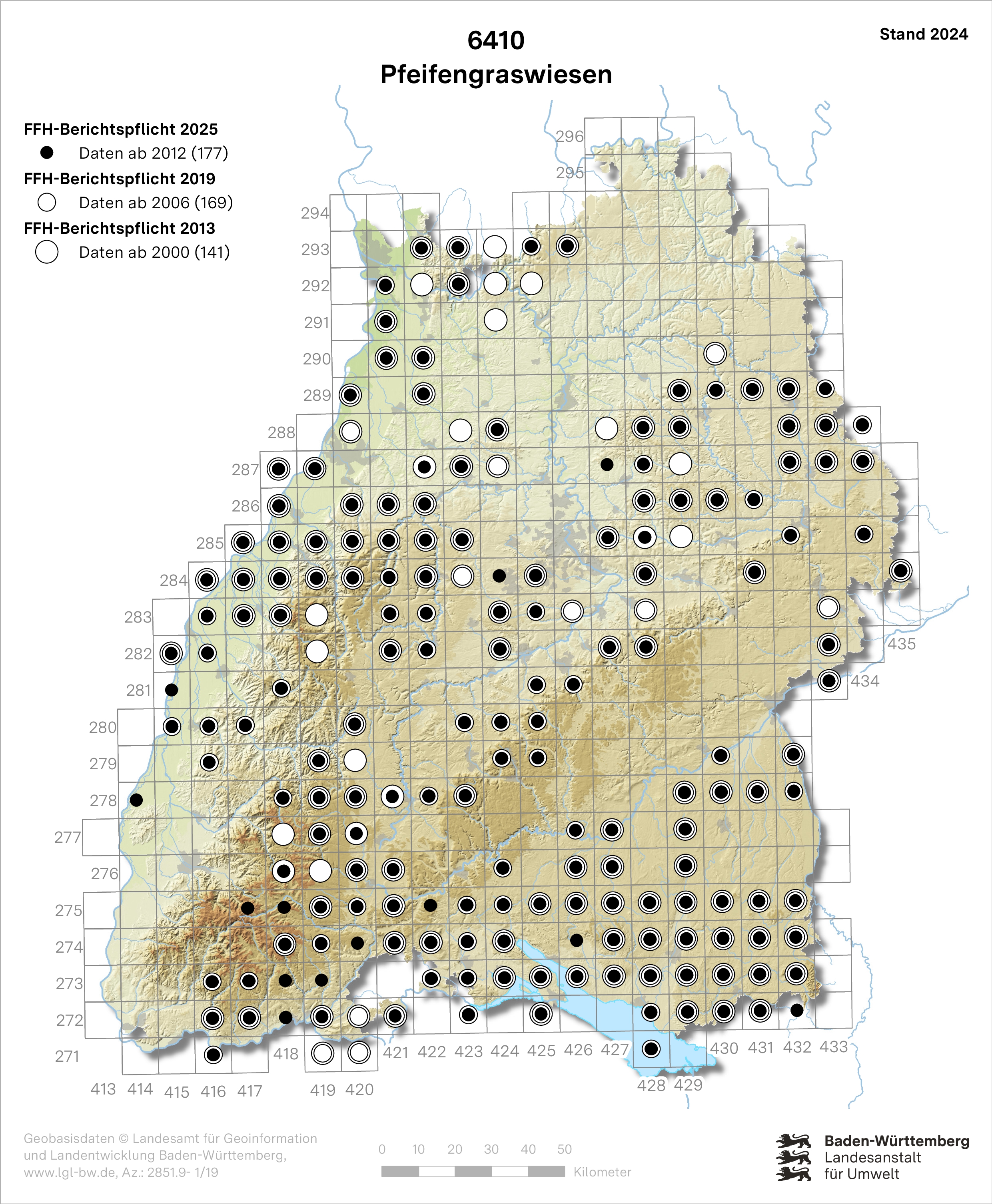 Pfeifengraswiesen haben ihre Verbreitungsschwerpunkte im Westallgäuer und Oberschwäbischen Hügelland, im Bodenseebecken und in der Oberrheinebene. Sie kommen aber auch in anderen Naturräumen vor. 2025 beträgt die gemeldete LRT-Gesamtfläche 620 ha. Der überwiegende Teil der Bestände des LRT liegt in FFH-Gebieten.