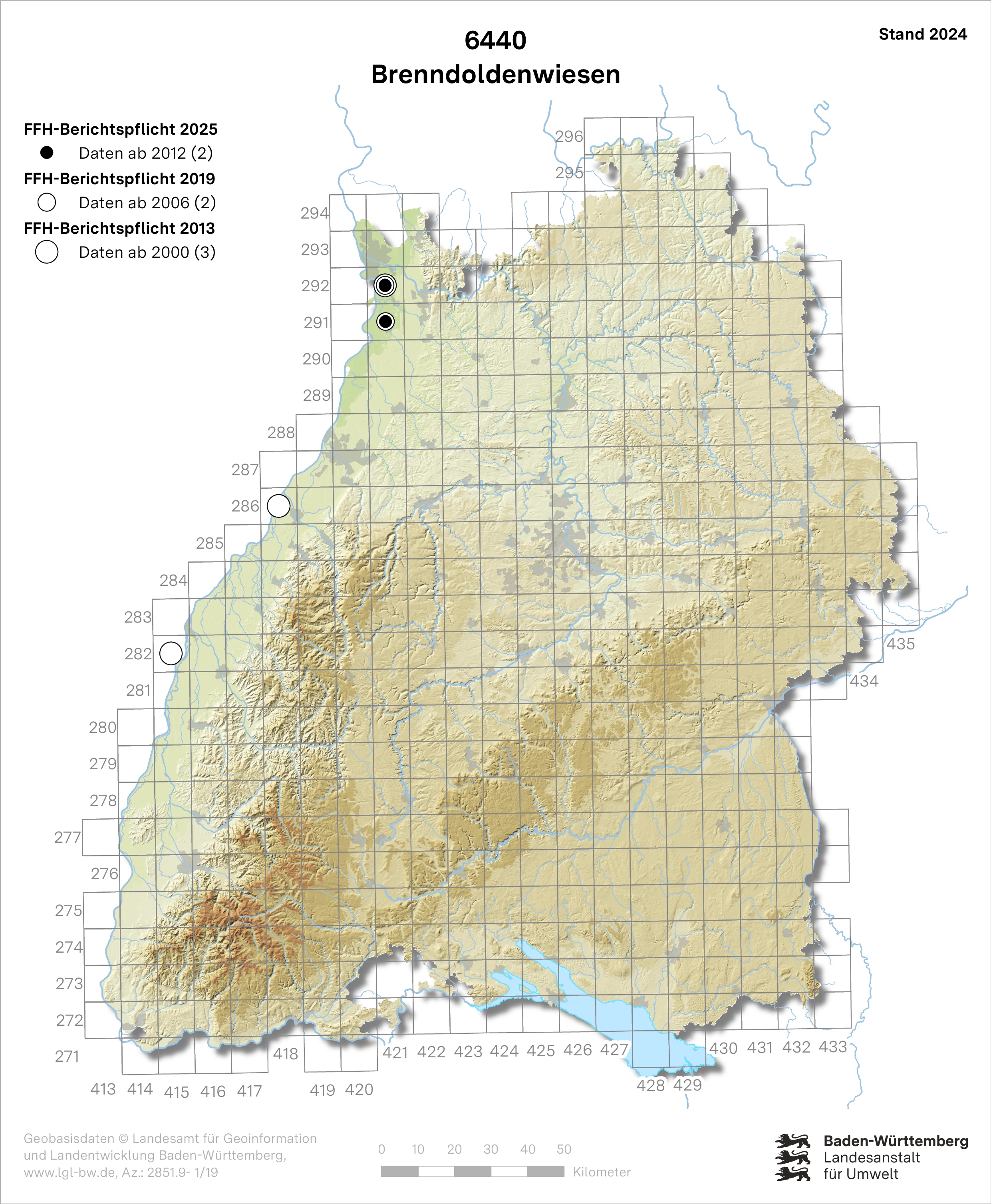 Der Lebensraumtyp ist heute nur noch an einer Stelle in einer feuchten Wiese (Rheinniederung zwischen Philippsburg und Mannheim) vorhanden. 2025 beträgt die gemeldete LRT-Gesamtfläche 2 ha. Alle bekannten Bestände des LRT liegen in FFH-Gebieten.
