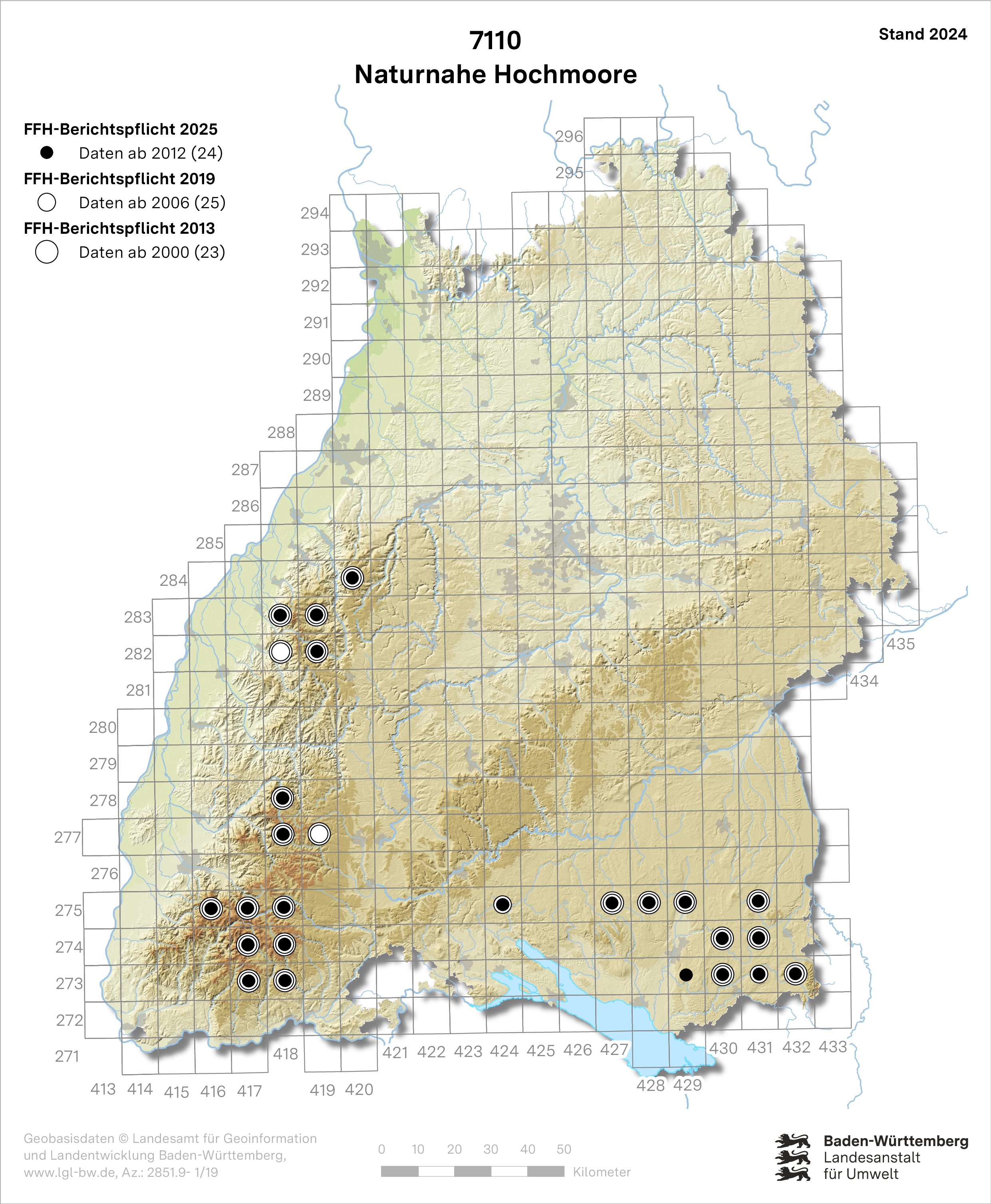 Der Lebensraumtyp 7110 kommt in Baden-Württemberg schwerpunktmäßig im Alpenvorland und im Schwarzwald vor. 2025 beträgt die gemeldete LRT-Gesamtfläche 310 ha. Die Bestände des LRT liegen nahezu vollständig in FFH-Gebieten.