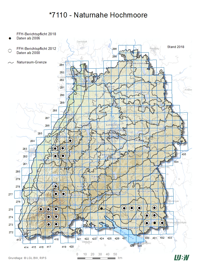 Der Lebensraumtyp 7110 kommt in Baden-Württemberg schwerpunktmäßig im Alpenvorland und im Schwarzwald vor. 2018 beträgt die gemeldete LRT-Gesamtfläche 400 ha. Die Bestände des LRT liegen nahezu vollständig in FFH-Gebieten.