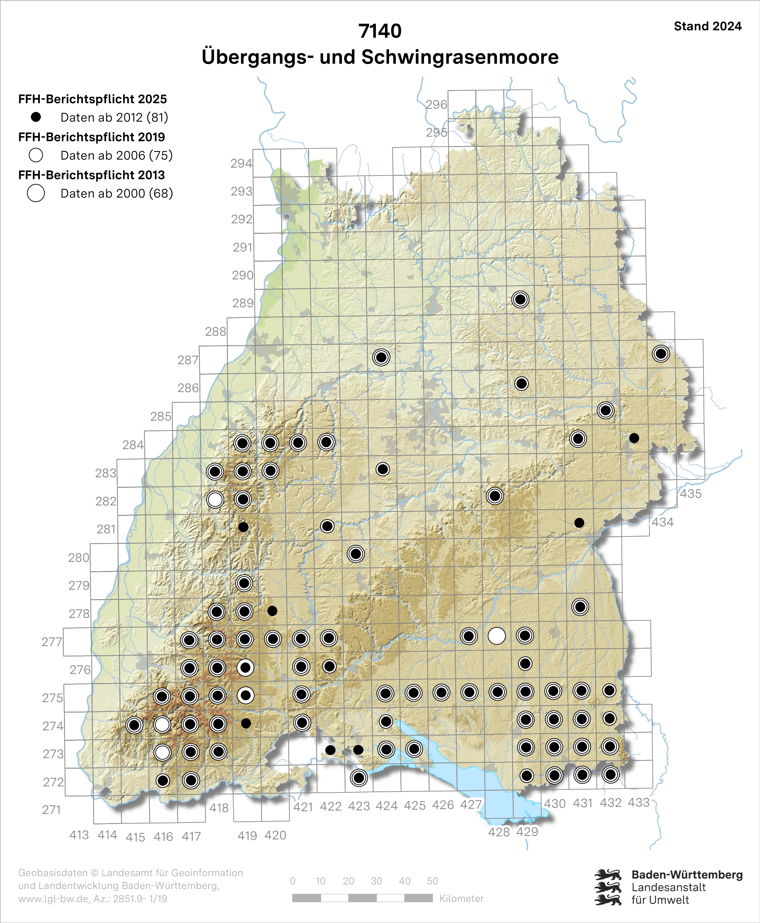 Die Verbreitungsschwerpunkte der Übergangs- und Schwingrasenmoore liegen in den Naturräumen Oberschwäbisches Hügelland, Westallgäuer Hügelland sowie Grindenschwarzwald und Enzhöhen. Weitere Vorkommen sind das Bodenseebecken, Hegau, Donau-Ablach-Platten, Riß-Aitrach-Platten, Baar, Hohenloher-Haller-Ebene, Sandstein-Odenwald, Mittlerer Schwarzwald, Südöstlicher Schwarzwald und Hochschwarzwald. 2025 beträgt die gemeldete LRT-Gesamtfläche 380 ha. Die Bestände des LRT liegen überwiegend in FFH-Gebieten.
