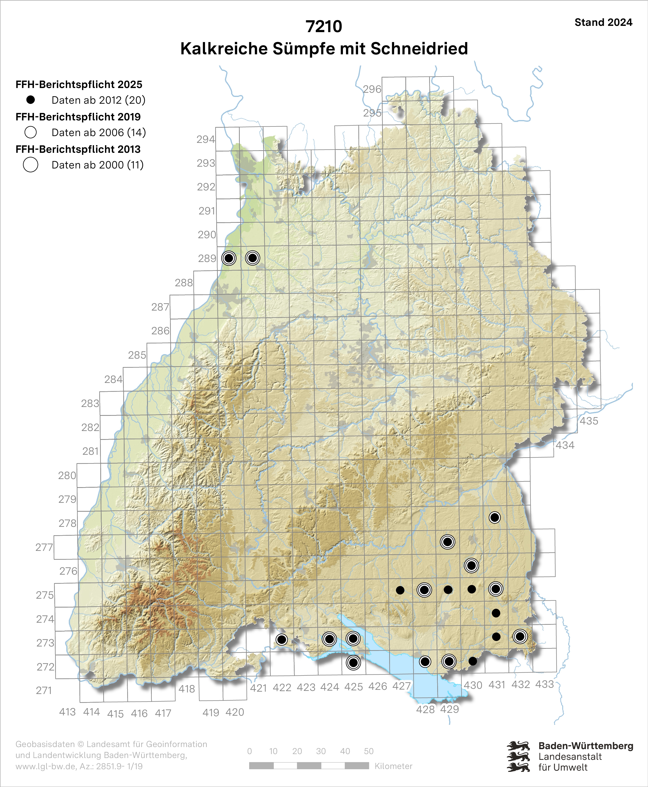Das Verbreitungsgebiet des Lebensraumtyps 7210 hat sich seit 1994 nicht verändert. Auch eine Flächenzunahme oder -abnahme der Kalkreichen Sümpfe mit Schneidried ist nicht bekannt. Die Hauptbeeinträchtigungen und -gefährdungen sind Entwässerung und Eutrophierung.