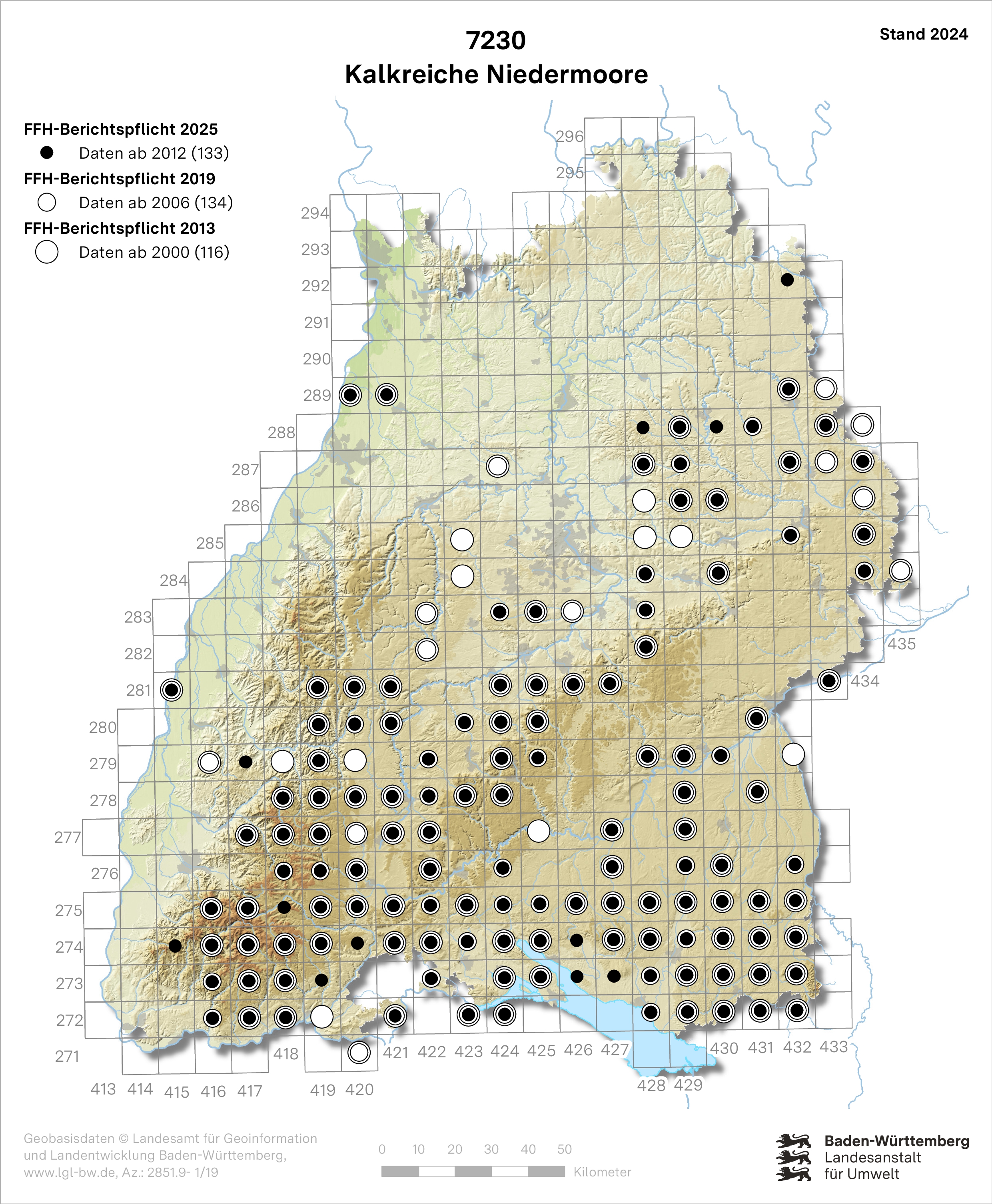Kalkreiche Niedermoore kommen schwerpunktmäßig in den Naturräumen Hegau, Bodenseebecken, Westallgäuer Hügelland, Donau-Ablach-Platten und Riß-Aitrach-Platten vor. Weitere Vorkommen gibt es im Oberschwäbischen Hügelland, Adelegg, Hügelland der unteren Riß, Unteren Illertal, Donauried, Baar-Alb, Oberen Donautal, in der Mittleren Flächenalb, im Südwestlichen Albvorland, Schurwald, Welzheimer Bergen, Alb-Wutach-Gebiet, Baar, Oberen Gäue, Hochschwarzwald, Kaiserstuhl und in der Offenburger Rheinebene. 2025 beträgt die gemeldete LRT-Gesamtfläche 220 ha. Der überwiegende Teil der Bestände des LRT liegt in FFH-Gebieten.