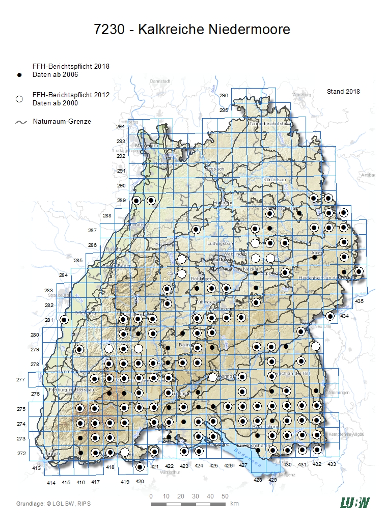 Kalkreiche Niedermoore kommen schwerpunktmäßig in den Naturräumen Hegau, Bodenseebecken, Westallgäuer Hügelland, Donau-Ablach-Platten und Riß-Aitrach-Platten vor. Weitere Vorkommen gibt es im Oberschwäbischen Hügelland, Adelegg, Hügelland der unteren Riß, Unteren Illertal, Donauried, Baar-Alb, Oberen Donautal, in der Mittleren Flächenalb, im Südwestlichen Albvorland, Schurwald, Welzheimer Bergen, Alb-Wutach-Gebiet, Baar, Oberen Gäue, Hochschwarzwald, Kaiserstuhl und in der Offenburger Rheinebene. 2018 beträgt die gemeldete LRT-Gesamtfläche 280 ha. Der überwiegende Teil der Bestände des LRT liegt in FFH-Gebieten.
