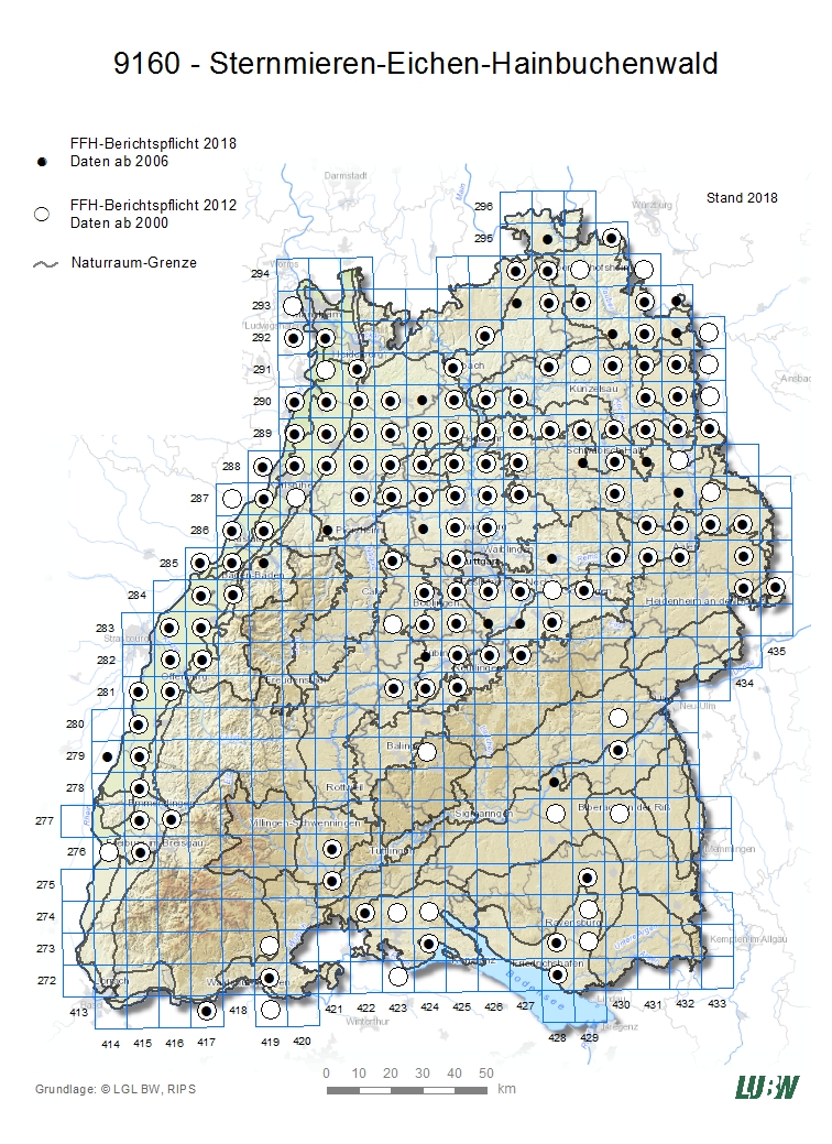 Die Verbreitungsschwerpunkte der Sternmieren-Eichen-Hainbuchenwälder sind in Baden-Württemberg im Oberrheinischen-Tiefland und auf den Neckar-Tauber-Gäuplatten. Sie fehlen in den Kernbereichen des Schwarzwaldes und im Hochrheingebiet. 2018 beträgt die gemeldete LRT-Gesamtfläche 3.349,7 ha. Der überwiegende Teil der Bestände des LRT liegt in FFH-Gebieten.