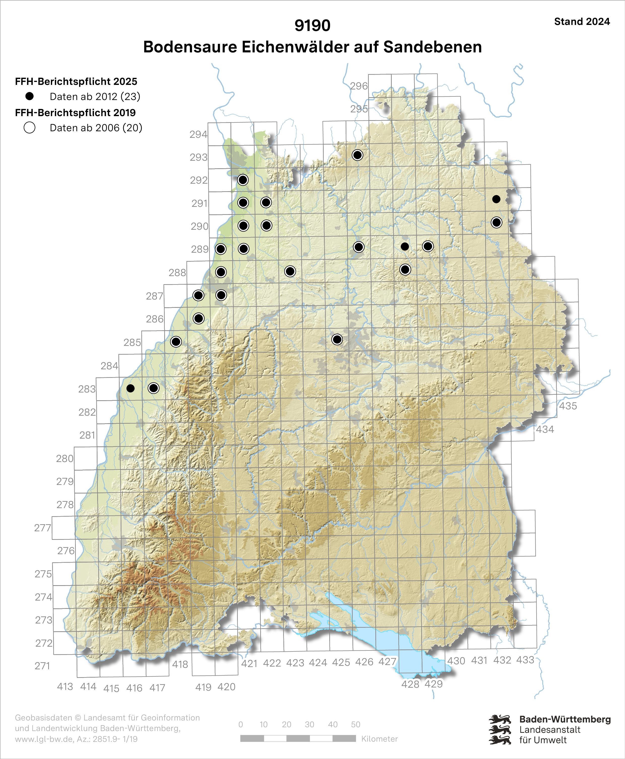Bodensaure Eichenwälder treten ausschließlich in den Naturräumen Hardtebenen, Nördliche Oberrhein-Niederung und der Neckar-Rheinebene auf. Birken-Stieleichenwälder kommen hauptsächlich im Strom- und Heuchelberg, im Schwäbisch-Fränkischen-Wald und im Sandstein-Odenwald vor. 2025 beträgt die gemeldete LRT-Gesamtfläche 323 ha. Der überwiegende Teil der Bestände des LRT liegt in FFH-Gebieten.