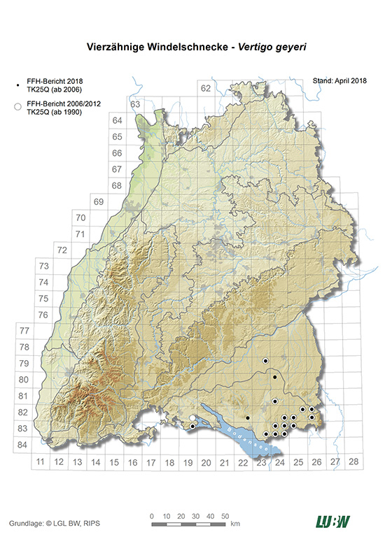 Eine Karte der FFH-Gebiete mit Vorkommen der Vierzähnigen Windelschnecke und weitere Informationen zu den Gebieten erhalten Sie im Daten- und Kartendienst der LUBW.