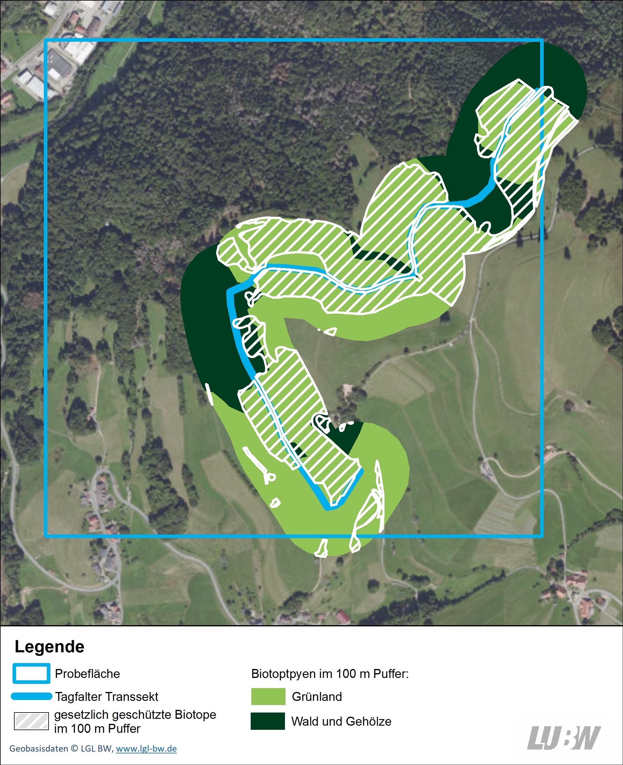 In Abbildung 2 ist dagegen ein artenreiches Transekt dargestellt. Der ausgewertete Pufferbereich wird dominiert von Wald und Grünland (Wiesen und Weiden). Ein großer Teil dieser Flächen ist durch die Offenland-Biotopkartierung erfasst (weiß schraffiert) und damit als Biotop nach § 30 Bundesnaturschutzgesetz (BNatSchG) und § 33 Naturschutzgesetz Baden-Württemberg (NatSchG) gesetzlich geschützt.