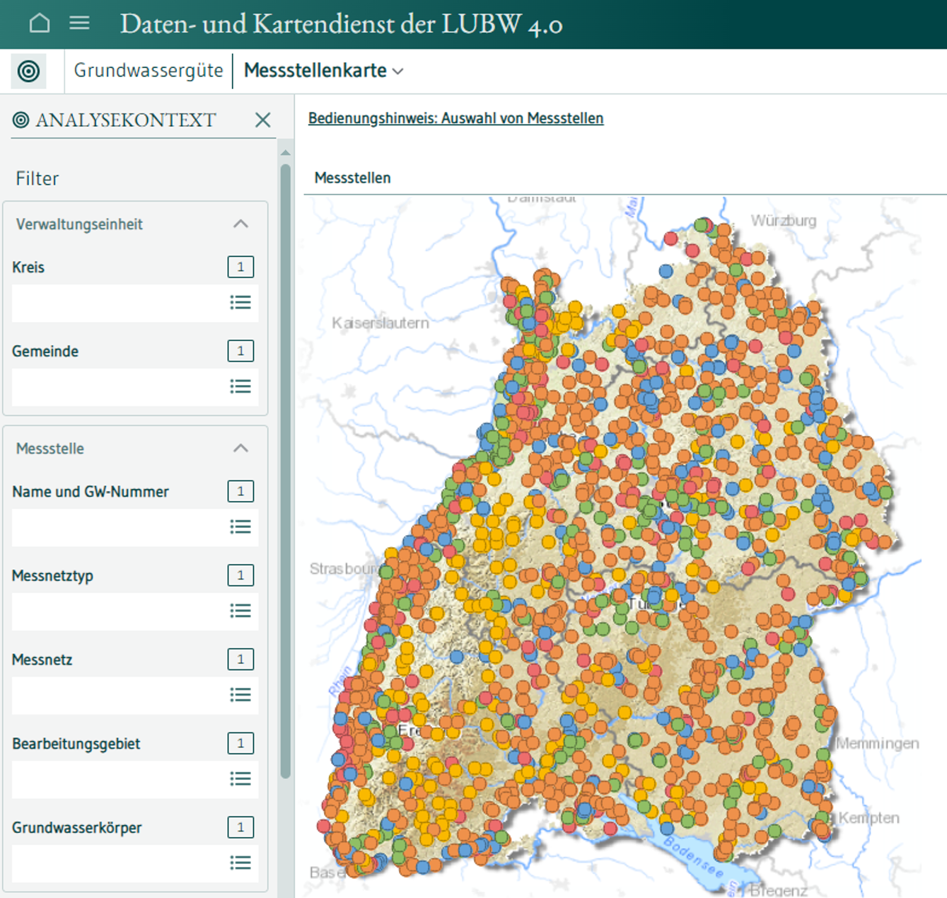 Der Jahresdatenkatalog Grundwasser Menge und Güte bietet Behörden, Universitäten, Ingenieurbüros, Schulen und der breiten Öffentlichkeit die Möglichkeit, sich über die vielfältigen Untersuchungsergebnisse und Messwerte aus dem Grundwasserüberwachungsprogramm der LUBW zu informieren. Er enthält ausgewählte physikalisch-chemische Messwerte, Grundwasserstände und Quellschüttungen aus dem Grundwasserüberwachungsprogramm der LUBW seit 2006 bzw. 2000. Weitere Messdaten können beim jeweils zuständigen Regierungspräsidium oder Landratsamt/Stadtkreis vorliegen.